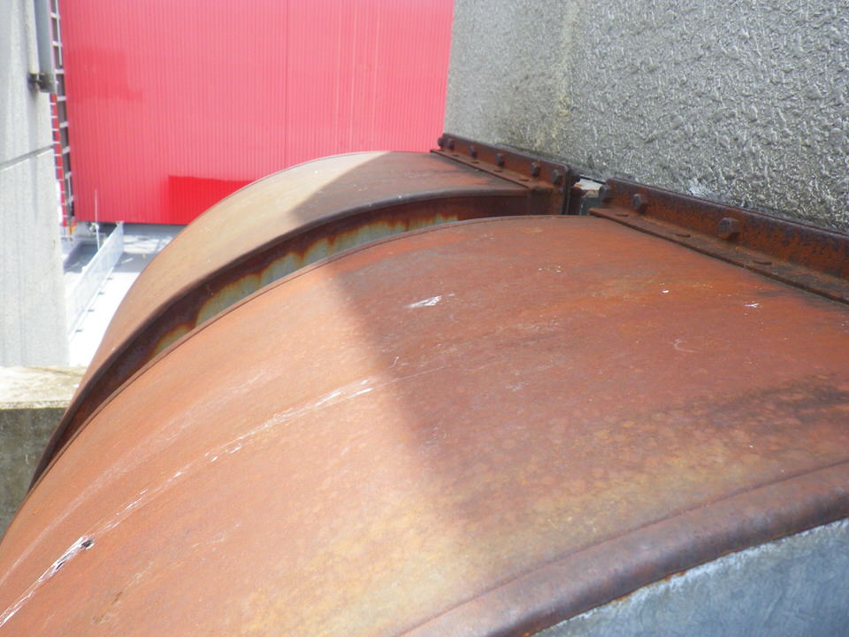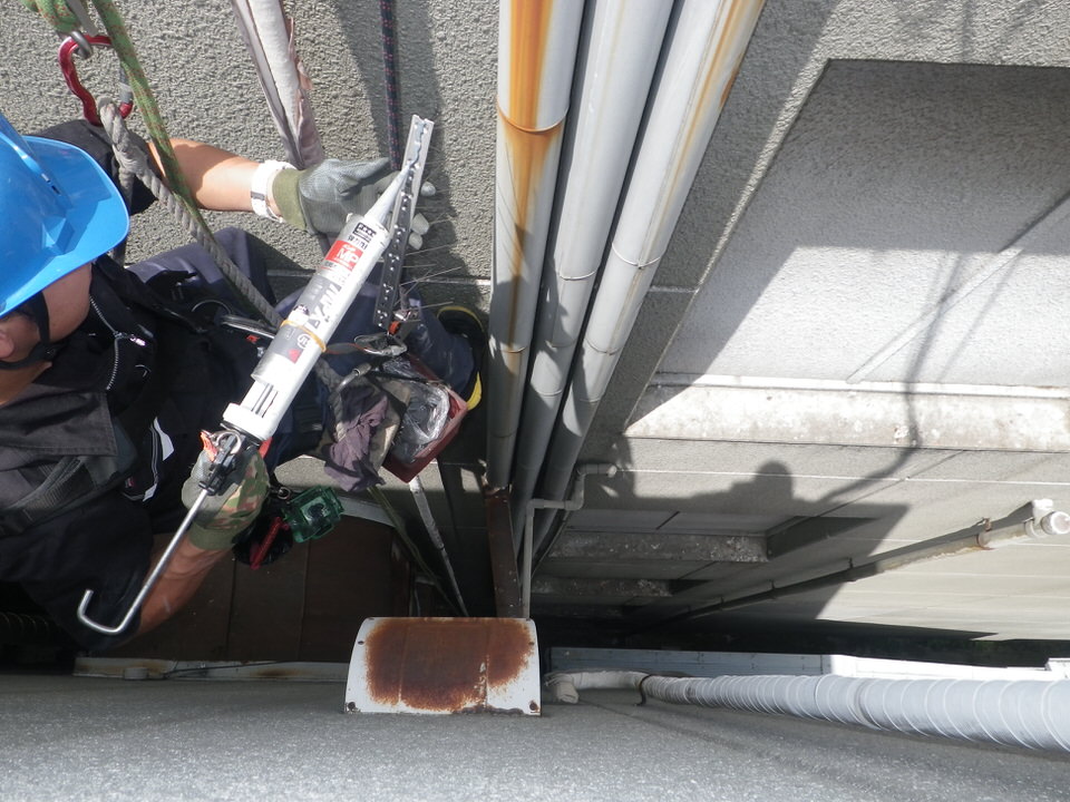 ◇状況を確認したところ、 ビルの屋上換気扇内と渡り廊下の 下部に鳩が定着して糞害が発生していました。 ビルとビルの間の壁面扉面台部分にも被害があり、 そちらはロープを使っての作業を行っています。