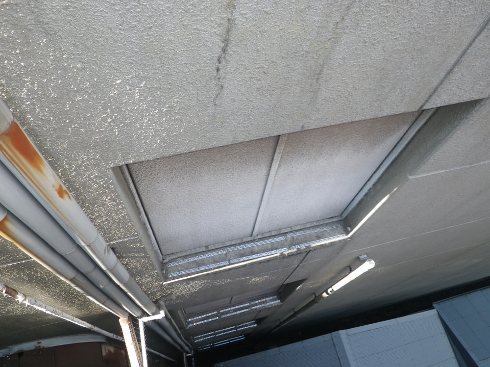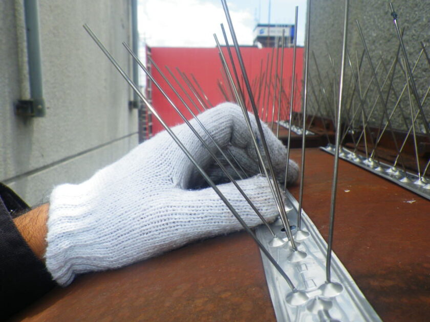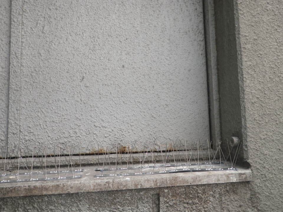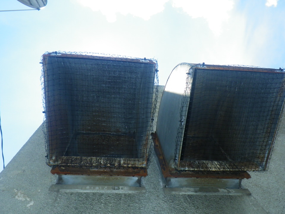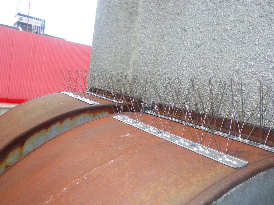 換気扇内、渡り廊下の糞清掃後、換気扇内と渡り廊下下部へは 侵入できないように防鳥ネットを使い、壁面扉面台には バードピン【防鳥剣山】を使い羽休めができないように対策を行っています。