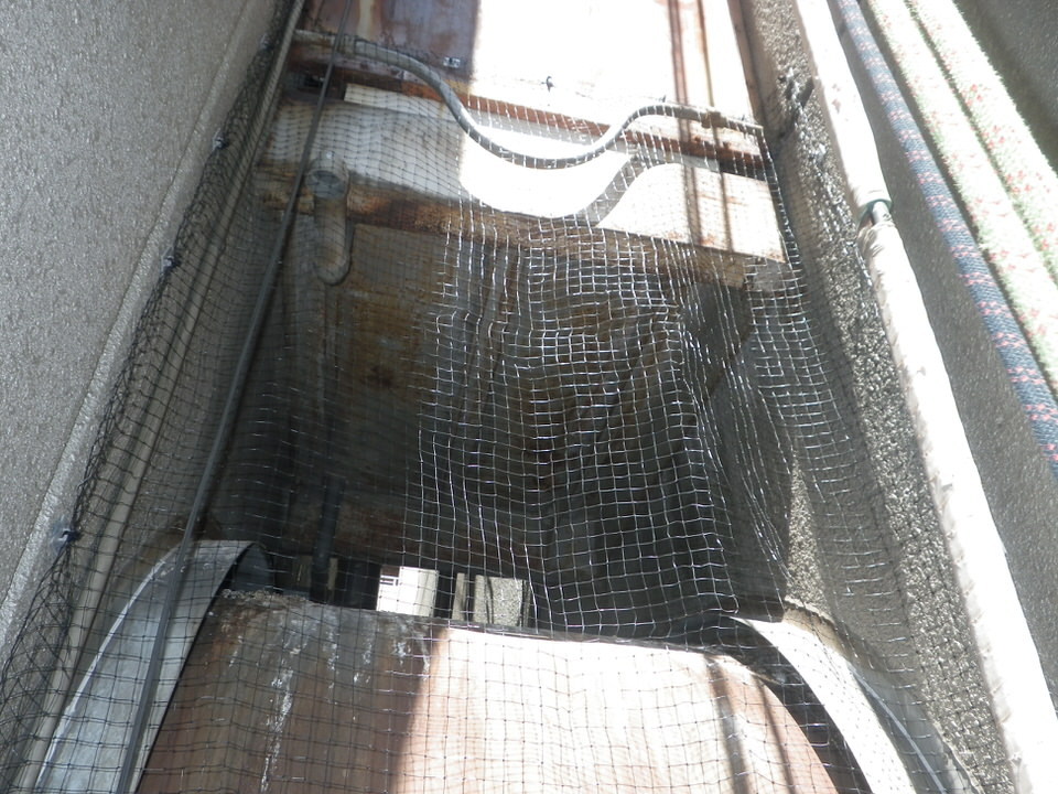 渡り廊下下部に侵入できないよう防鳥ネットを設置
