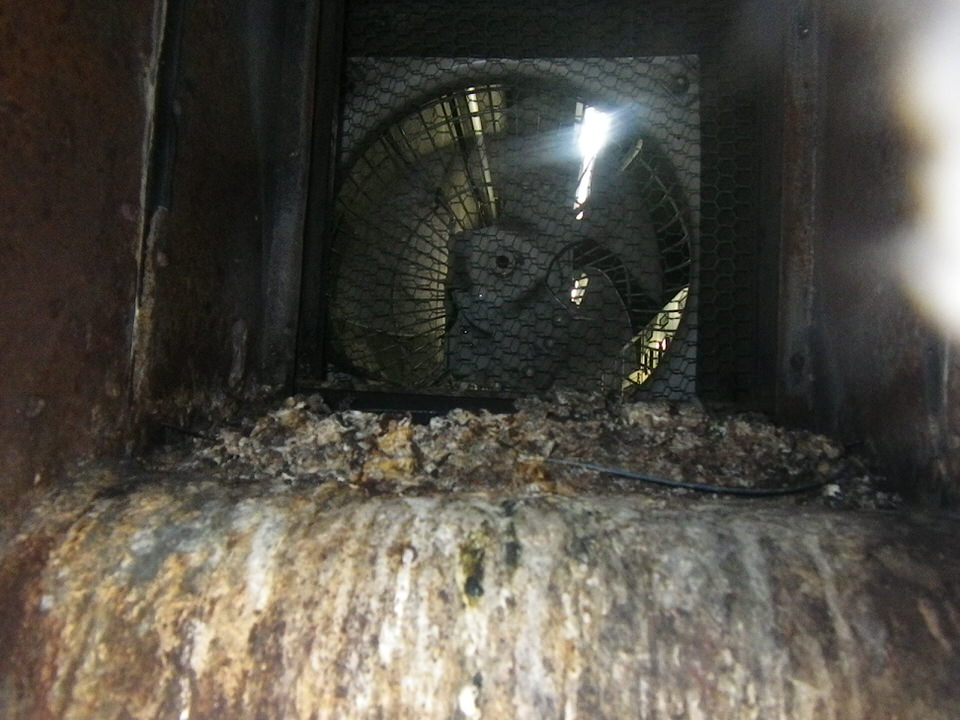 換気扇内部にある大量の糞をヘラでこそいでいます。